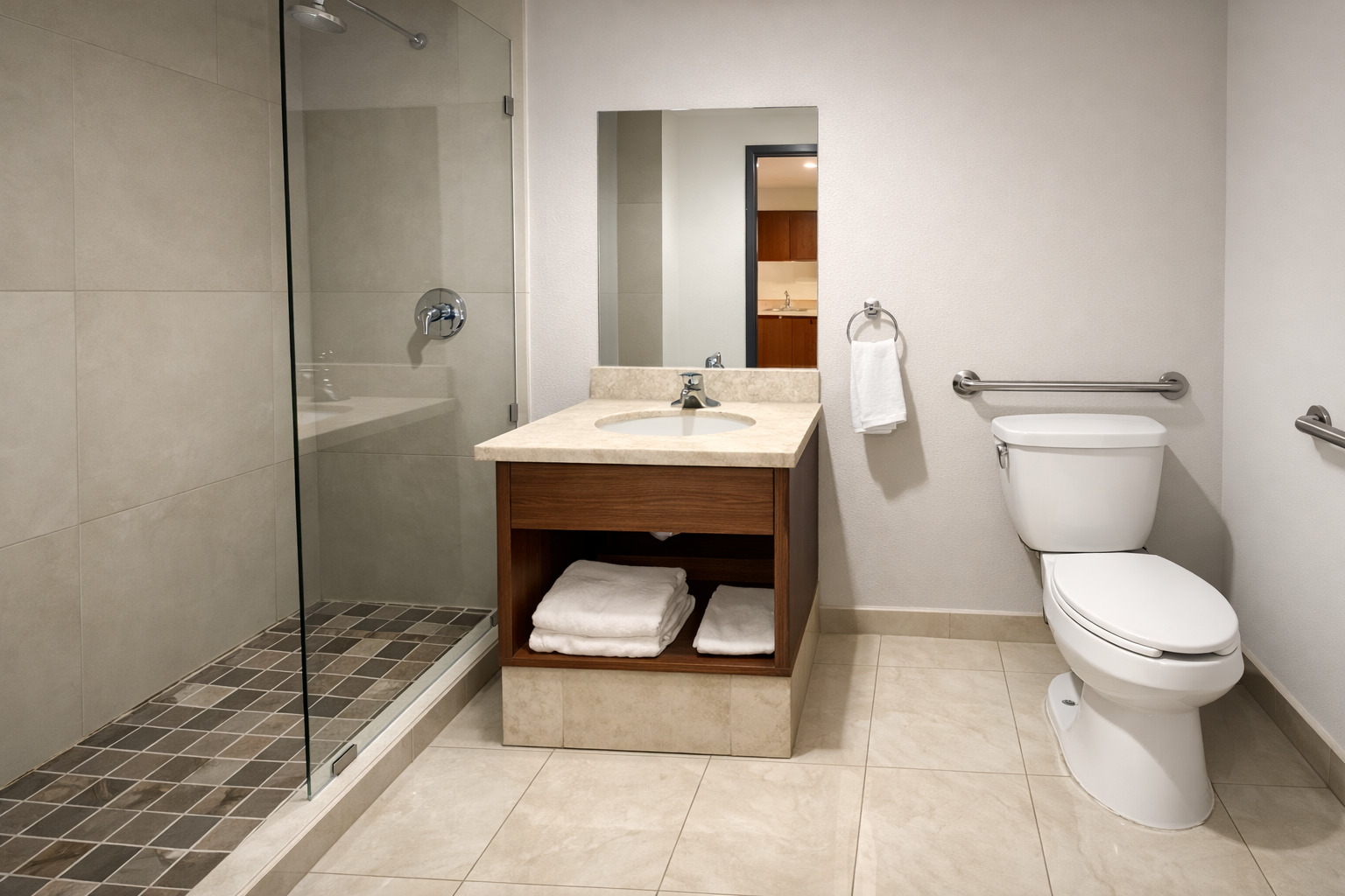La habitación handicap diseñada para personas con alguna movilidad limitada ha sido cuidadosamente planificada para ofrecer comodidad y accesibilidad. En ella, se encuentra una cocineta equipada con microondas y refrigerador. Cuenta con una cama queen size, un baño adaptado con barras de apoyo y asiento de ducha, una televisión de pantalla plana. Un sofá cama para huéspedes adicionales. Cada elemento ha sido seleccionado y dispuesto con el objetivo de brindar un ambiente acogedor y funcional que garantice la comodidad y seguridad de los usuario